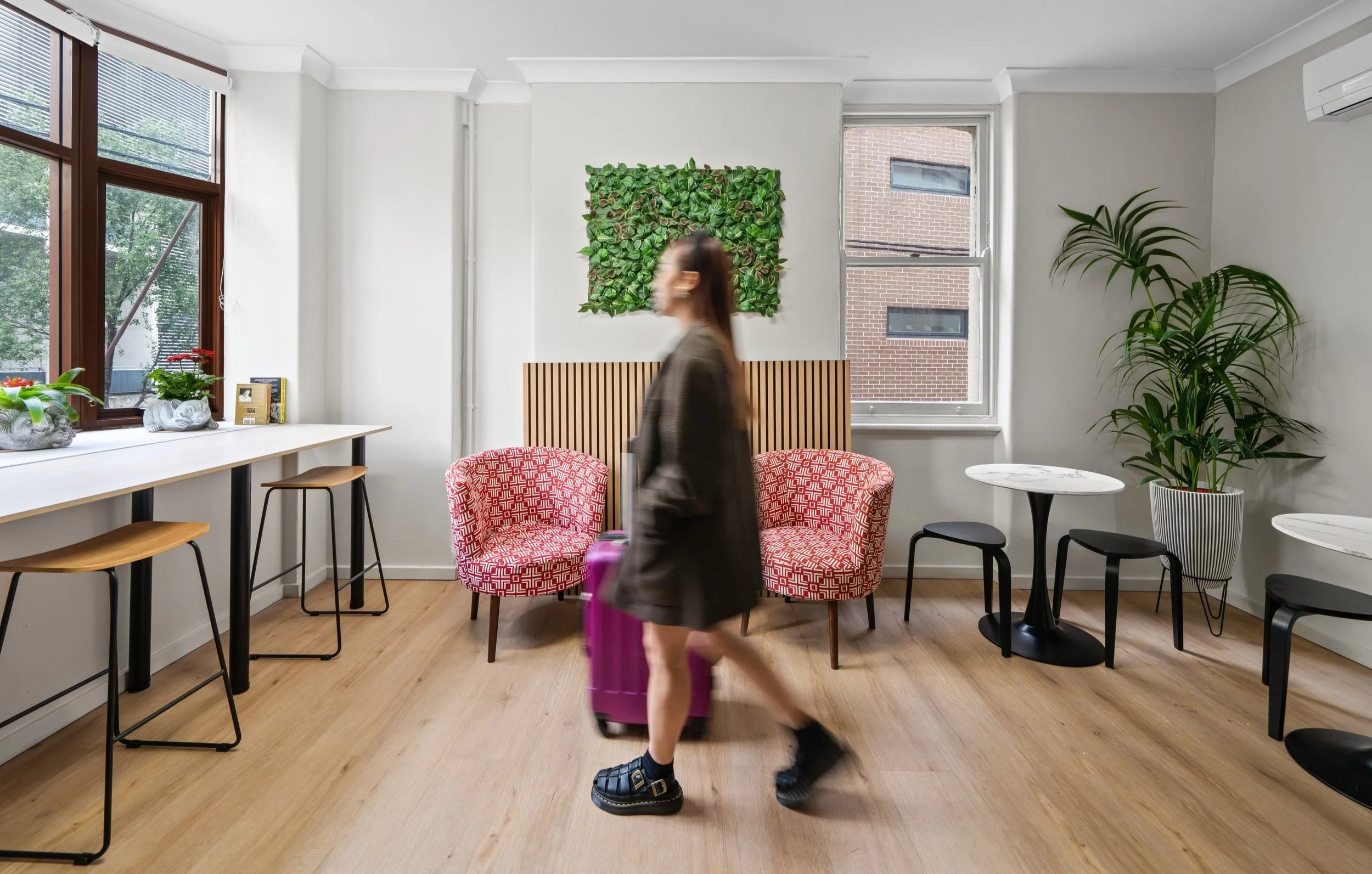 Rooms with workspaces, private fridges, fast wifi. Communal areas for socialising & co-working & a private roof top to immerse yourself in Sydneys buzzing city atmosphere.